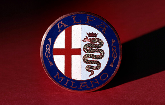 The unbreakable bond with Milan is the cornerstone of Alfa Romeo’s global image. The idea for the logo comes from a young illustrator named Romano Cattaneo, a great friend of Giuseppe Merosi. While he was waiting for tram number 14 in Piazza Castello, his attention was caught by the Biscione Visconteo on the main tower of the Castello Sforzesco. It was love at first sight, but something was still missing. Cattaneo and Merosi worked on different versions: the most convincing one showed the Biscione dragon on one side, and the emblem of the City of Milan, a red cross on a white background, on the other.